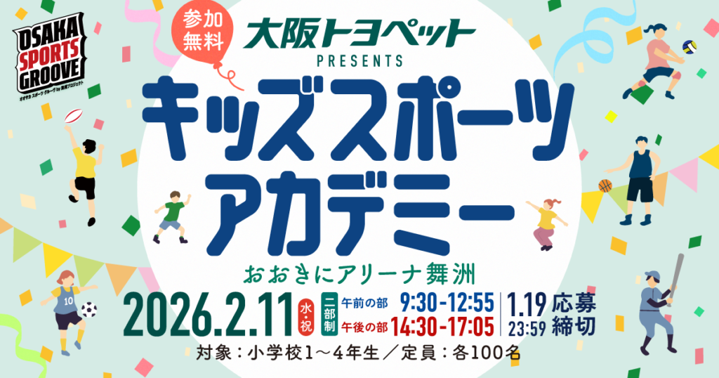 「大阪トヨペット presents OSAKA SPORTS GROOVE キッズスポーツアカデミー 〜サッカー&バレーボール&野球&ラグビー&バスケットボール〜」を開催いたします!